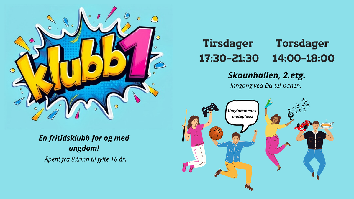 Klubb1 er et gratis fritids- og kulturtilbud til alle ungdommer fra 8. klasse på ungdomsskolen til 3. trinn på videregående skole. På ungdomsklubb kan du være sammen med venner, bli kjent med andre, delta på aktiviteter og utflukter, og mye mer. Ofte serveres det gratis mat også!