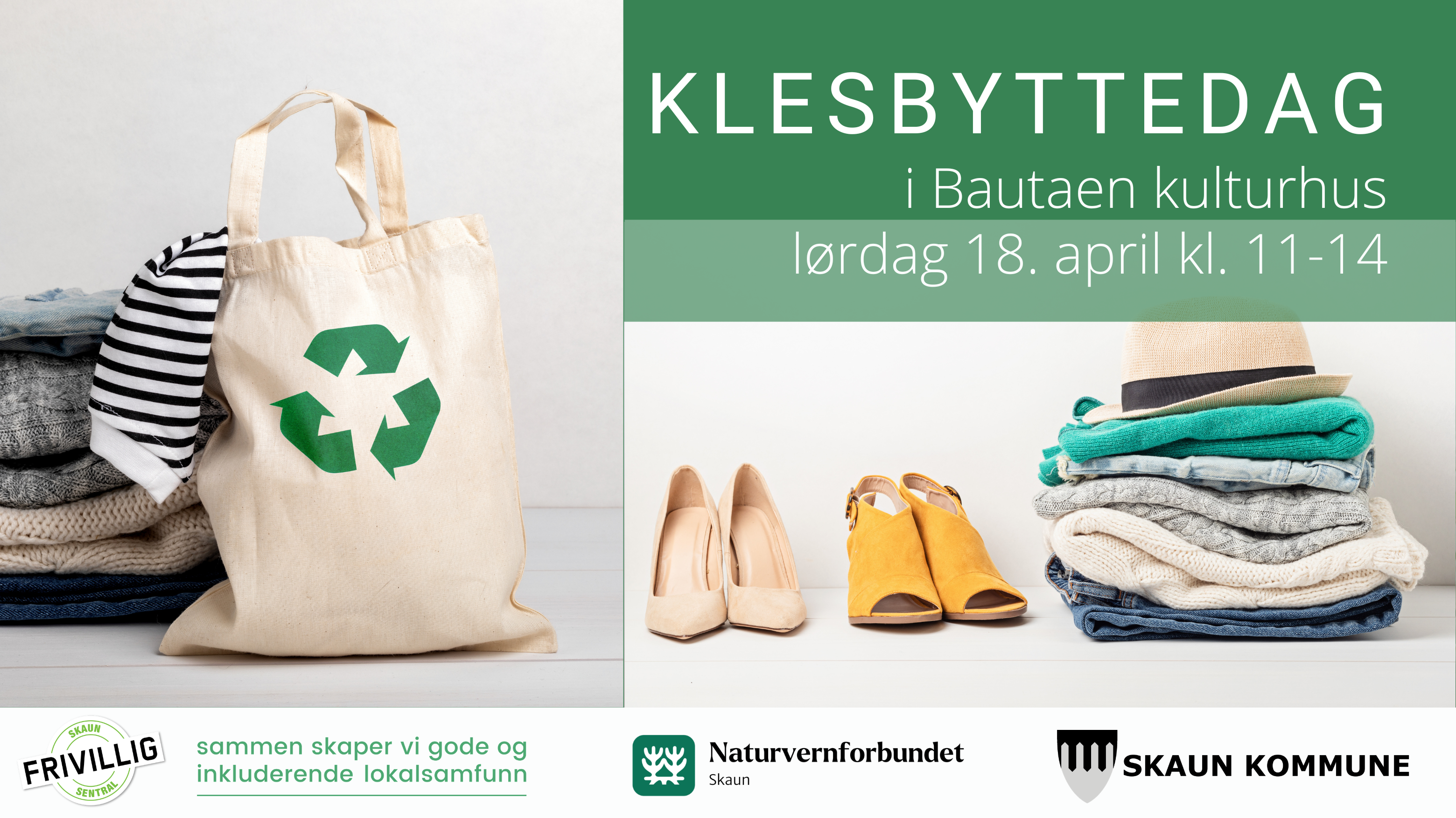 Velkommen til KLESBYTTEDAG i Bautaen kulturhus!Forny garderoben din på en miljøsmart og hyggelig måte. Lever maks syv rene og 'freshe' plagg, i fin stand. For hvert plagg du leverer inn får du utdelt en klesbyttelapp og kan velge deg ut et nytt plagg. Kanskje du finner årets 17. maihabitt ;-)?