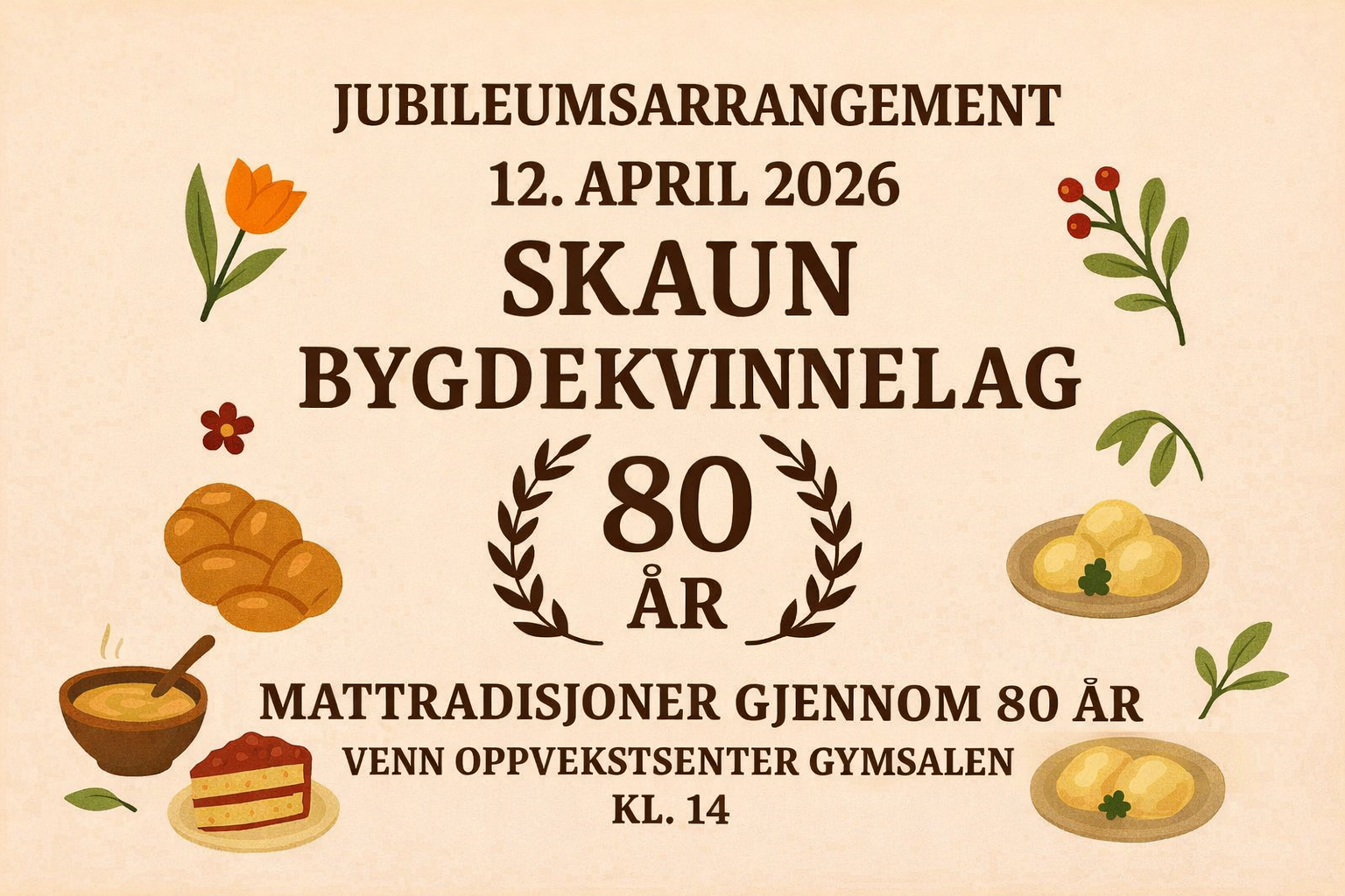 Skaun bygdekvinnelag fyller 80 år i 2026! Velkommen til markering!Vi feirer 80 år ved å invitere til en mimrestund over mattradisjoner, matskikker og tidsbilder. Kom og smak deg gjennom 8 ti-år med mathistorie. Vi fyller gymsalen på Venn skole med 8 bord som viser tidstypiske trekk av mat og kjøkken for hvert ti-år.