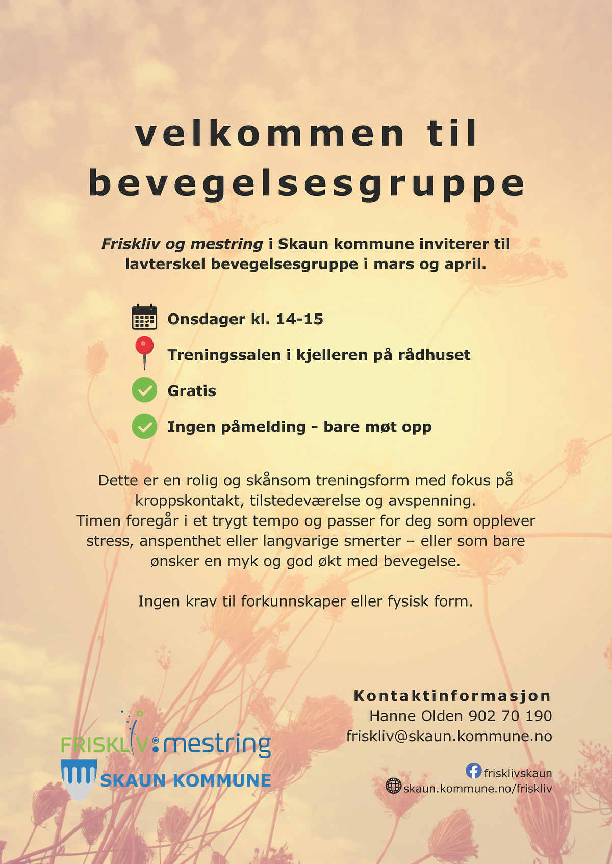 Vel møtt til en rolig og skånsom treningsform med fokus på kroppskontakt i regi Friskliv og mestring