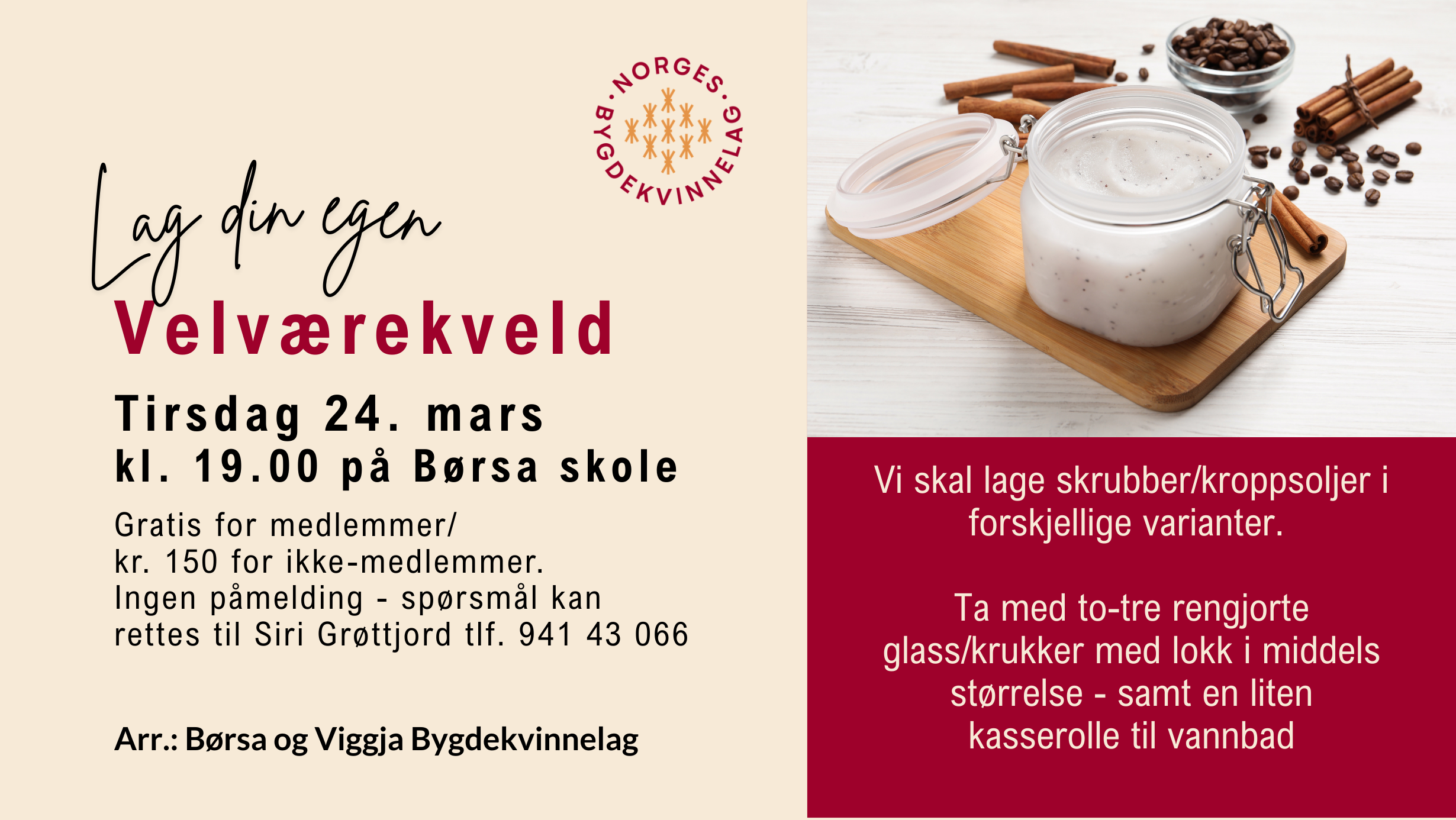 Velkommen til en hyggelig og inspirerende velværekveld der vi sammen lærer å lage naturlige, velduftende og hudvennlige hjemmespa‑produkter! Kvelden passer for alle som ønsker litt egenomsorg, kreativ hygge og kunnskap om enkle, rene produkter du kan lage hjemme.🌿 Dette kan du lage: